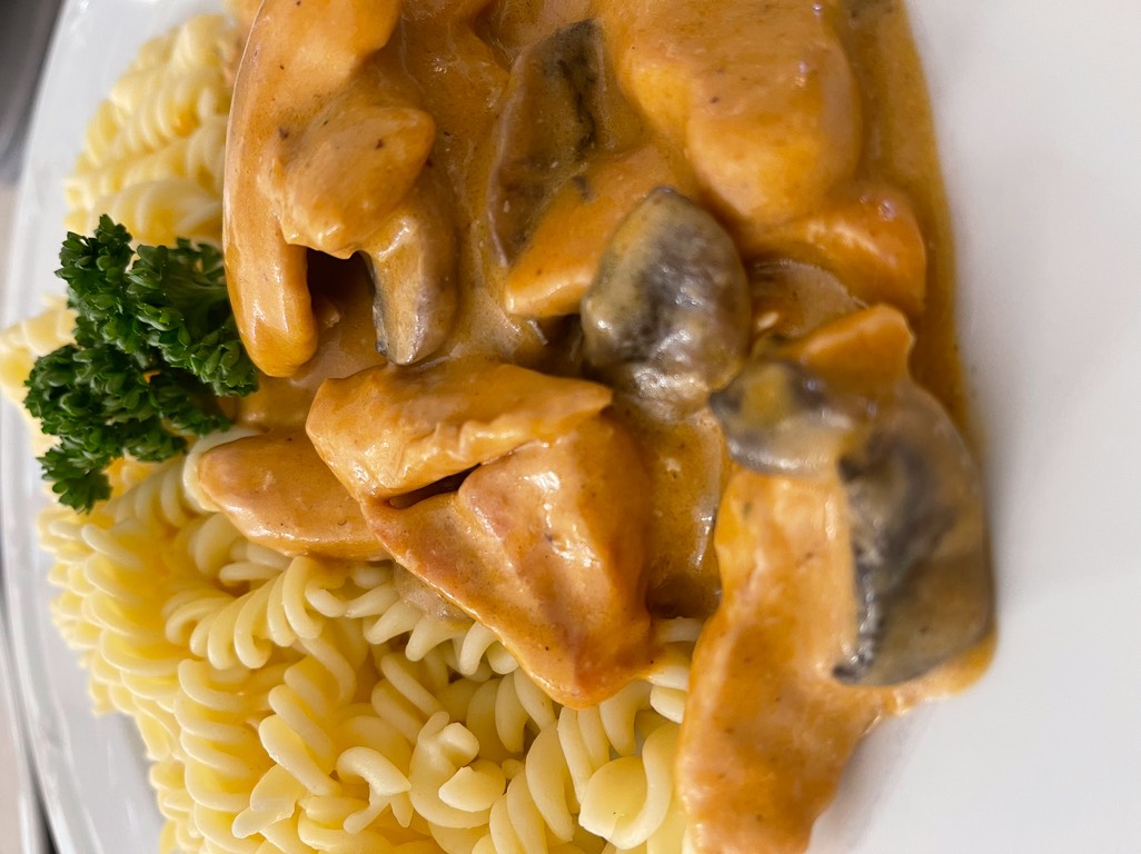Emincé de Filet de poulet " Zurichoise“, pâte, crudités