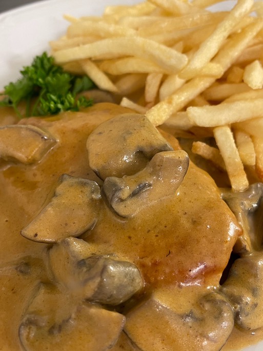 Filetto di pollo con Calvados-crema, patate fritte, insalata