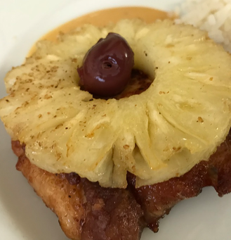 Bistecca di maiale con Gin-Ananas, risso, insalata